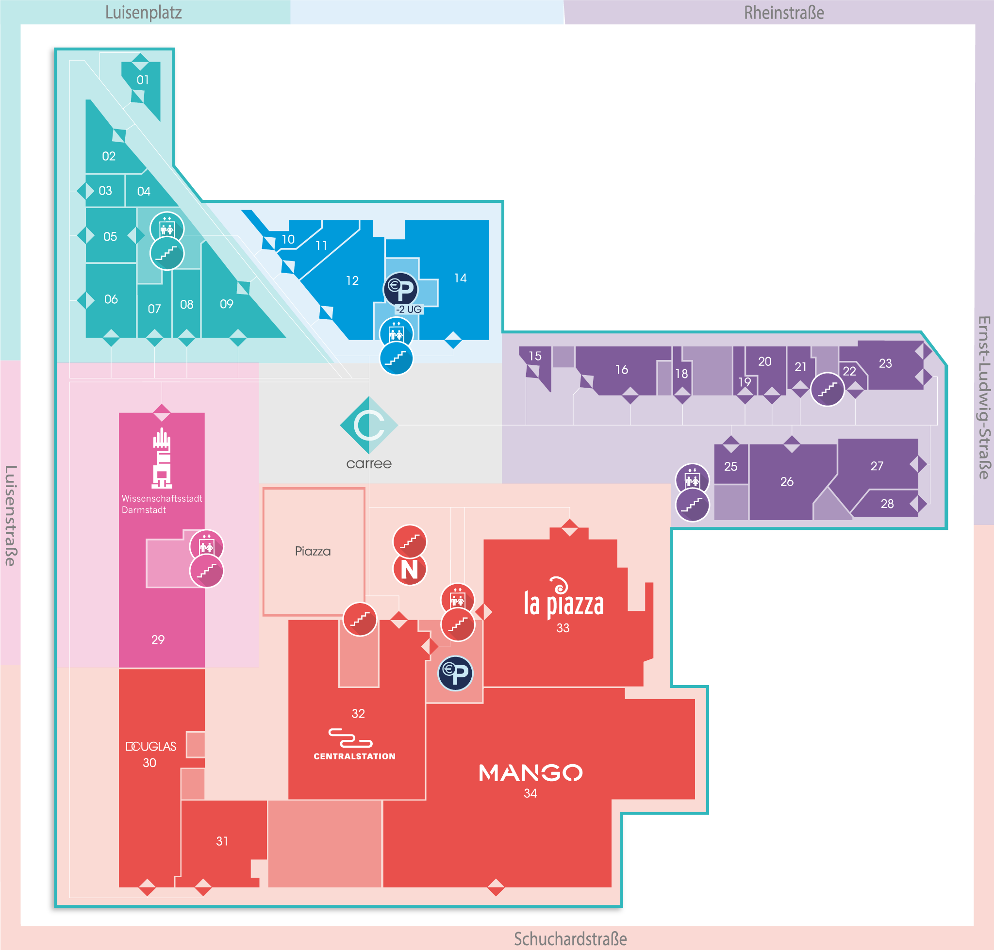 Bergsträßer Kaffeerösterei (10) Tabak, Presse, Lotto (11) VAUDE (12) K & K (14) Parkautomat -2. UG |